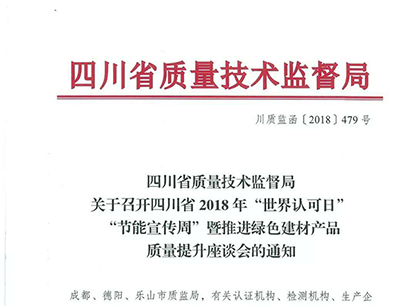 2018年6月8日,由四川省質(zhì)量技術(shù)監(jiān)督局主辦,省建材院承辦以“認(rèn)證認(rèn)可傳遞市場信任、服務(wù)市場監(jiān)管”“建設(shè)美麗中國、促進(jìn)綠色發(fā)展”為主題的四川省2018年“世界認(rèn)可日”“節(jié)能宣傳周”暨推進(jìn)綠色建材產(chǎn)品質(zhì)量提升座談會(huì)在成都召開。省建材院首席專家秦鋼、副院長趙斌、院長助理趙飛、張磊等出席了座談會(huì)。
